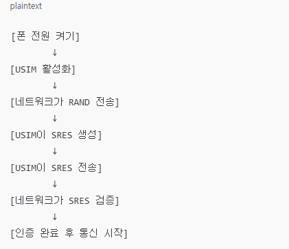 USIM 칩 내부에서는 비밀 키(Ki) 와 받은 RAND를 이용해, 암호화 알고리즘(A3 알고리즘 등)을 통해 응답값(SRES)을 생성합니다.